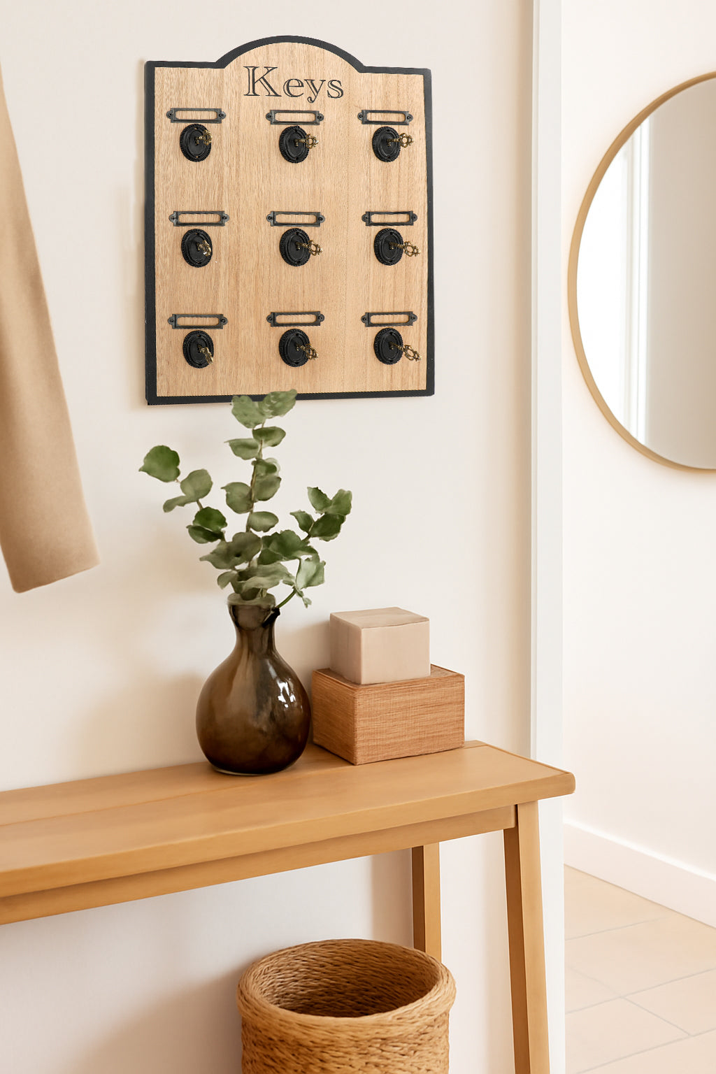 • Bring a Vintage Luxe touch to your hallway or entrances with this stylish wooden plaque for key hanging. With its Retro Charm and key fob hooks, this statement accent is perfect for keeping your keys organised in one place.