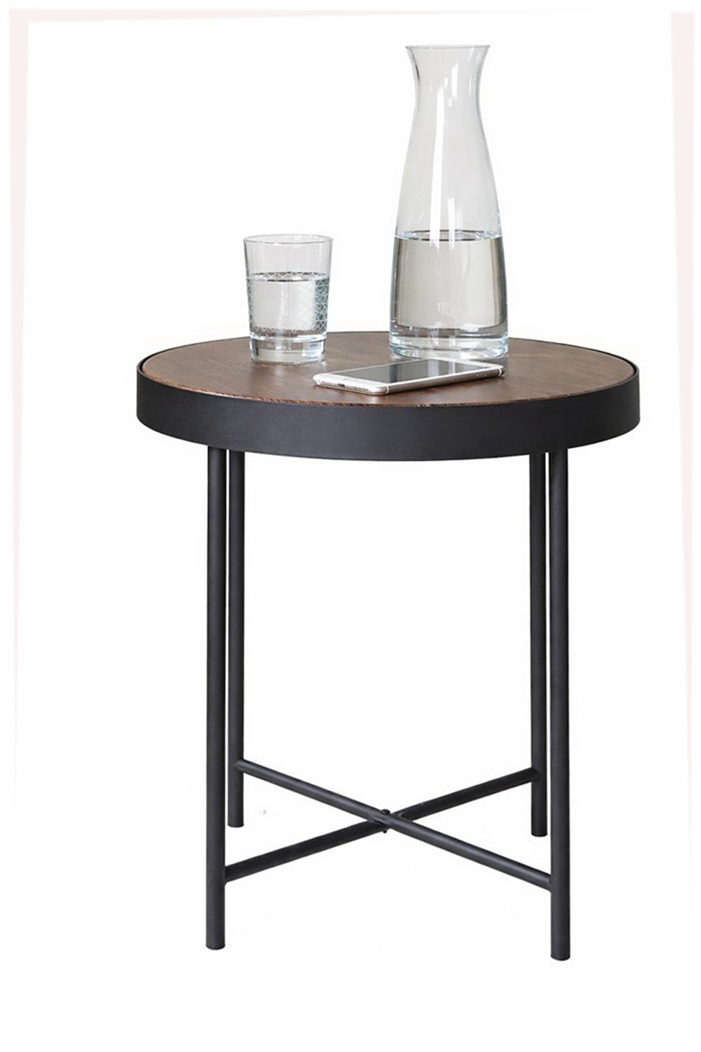 • Give your decor an industrial look with the Arcadia table. A cross-shaped metal base and round wooden top adds a fashionable and airy look to any living space.