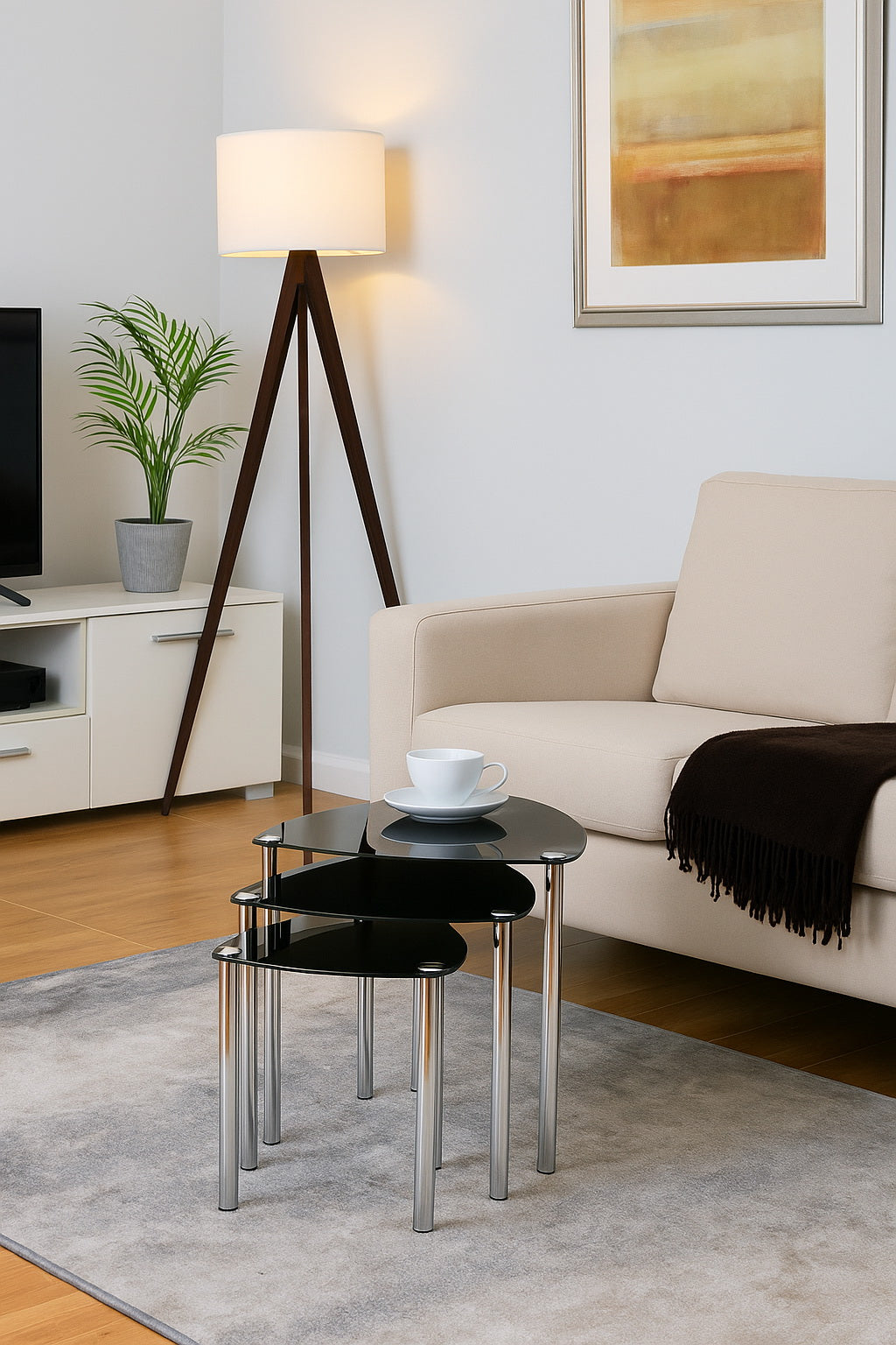 • Arena Set of 3 Glass Triangle Nesting Tables-Black glass, steel tubes in a chrome finish.