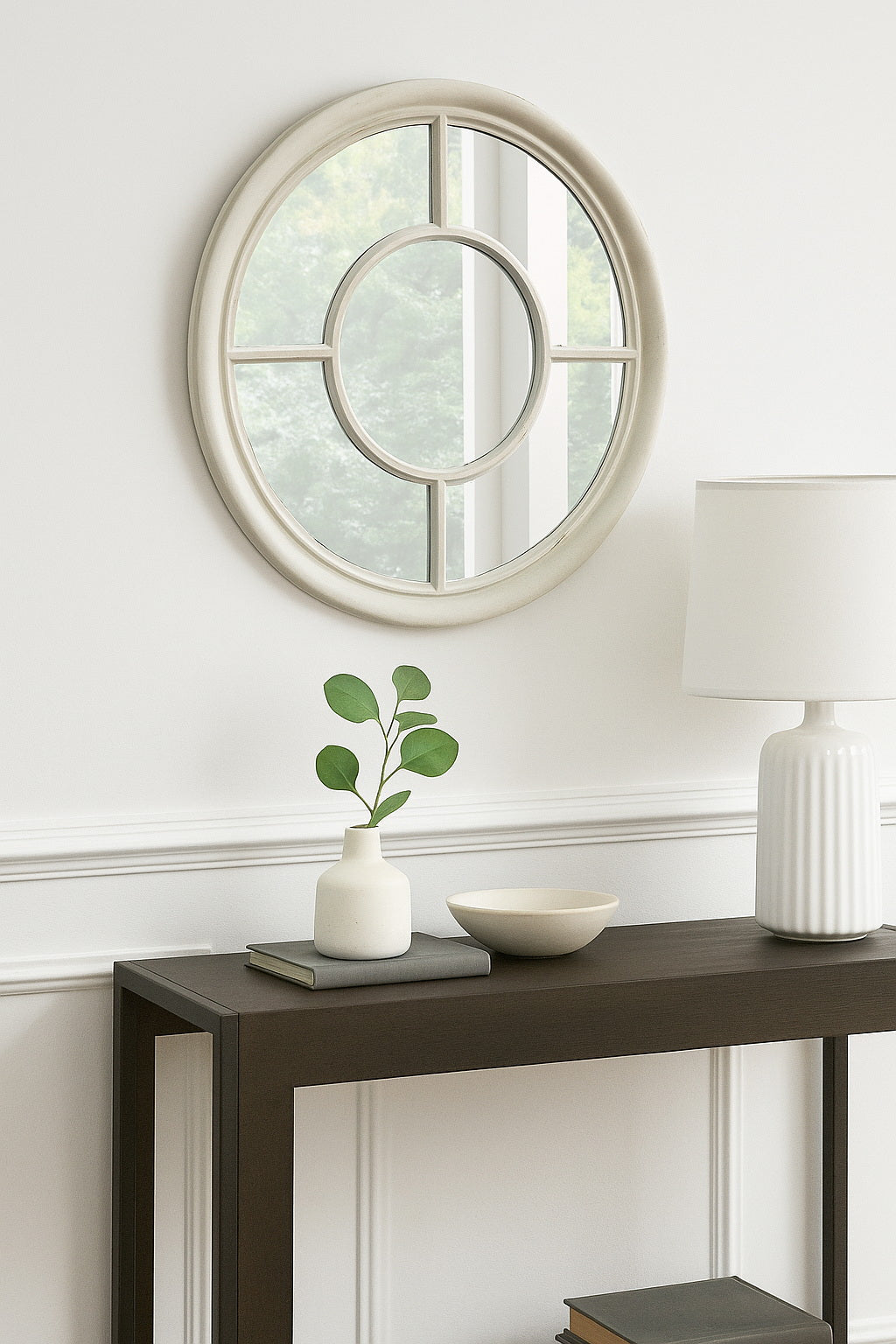 • With a painted off-white, distressed frame and lovely round shape, our window mirror will make the perfect addition to your hallway or conservatory.