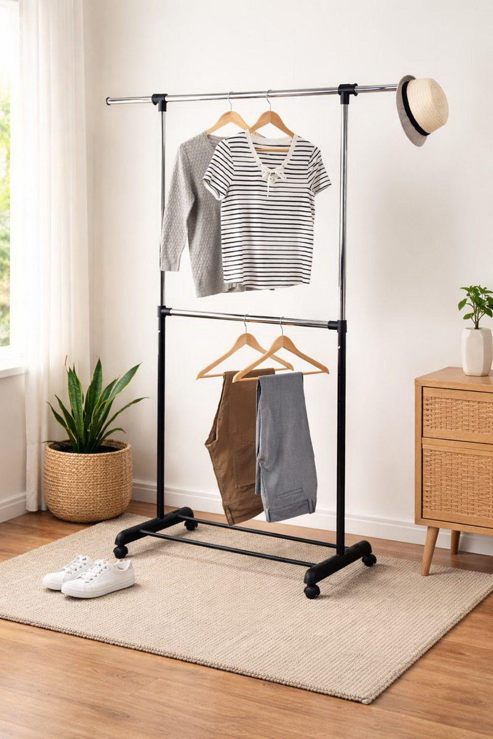• The double hanging space allows room for shorter garments, such as pants, sweaters, and shirts. The additional center hanging bar can be used to dry your shirts on hangers. This versatile garment rack features smooth-rolling wheels to make moving garments from the laundry room to your closet quick and easy.  The chrome and black finish will blend with most room decors and enhance its charm.