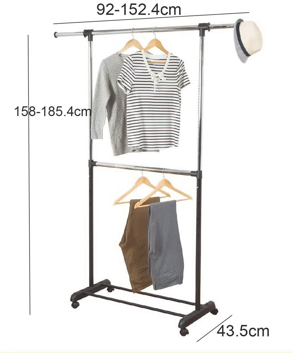 • Adjustable height and width rolling garment rack is a perfect way to organize your clothing. The top rod extends horizontally from 92-152.4 cm  to provide more storage and hanging options.  The rack’s height can be adjusted from 158 to 185.4cm to accommodate your growing storage needs.