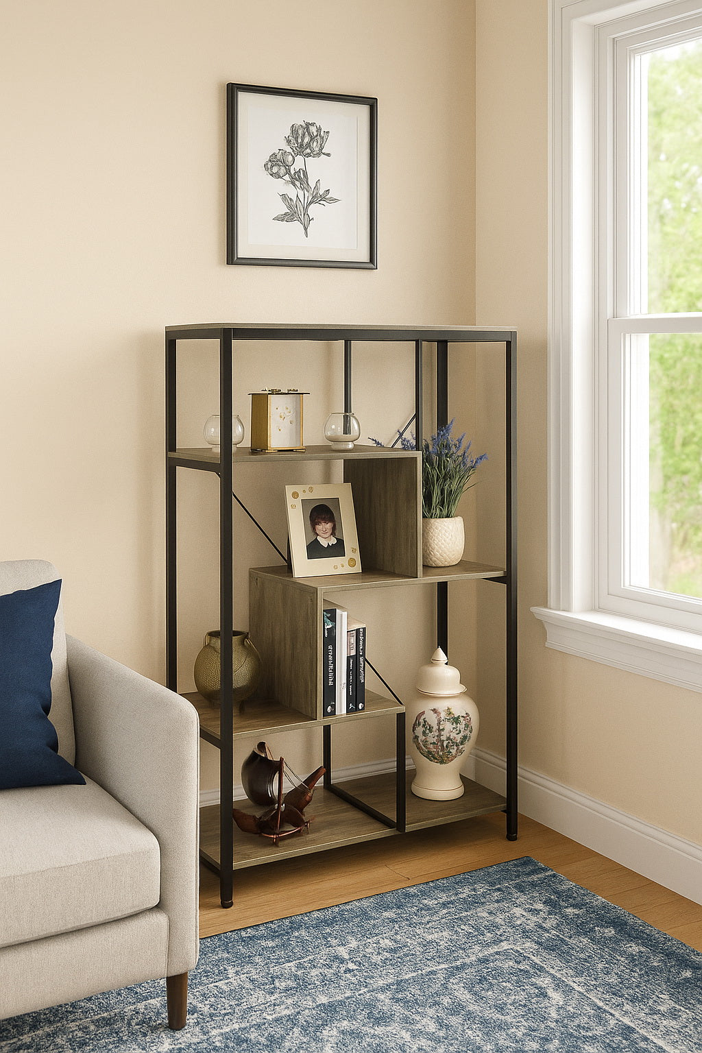 • You'll love the unique design of our Estelle Bookshelf. With five compartments for storing books and knickknacks, an easy to assemble sturdy metal and wood construction and it has a fun modern look. The Estelle Bookshelf is a functional storage solution for any room in your home.