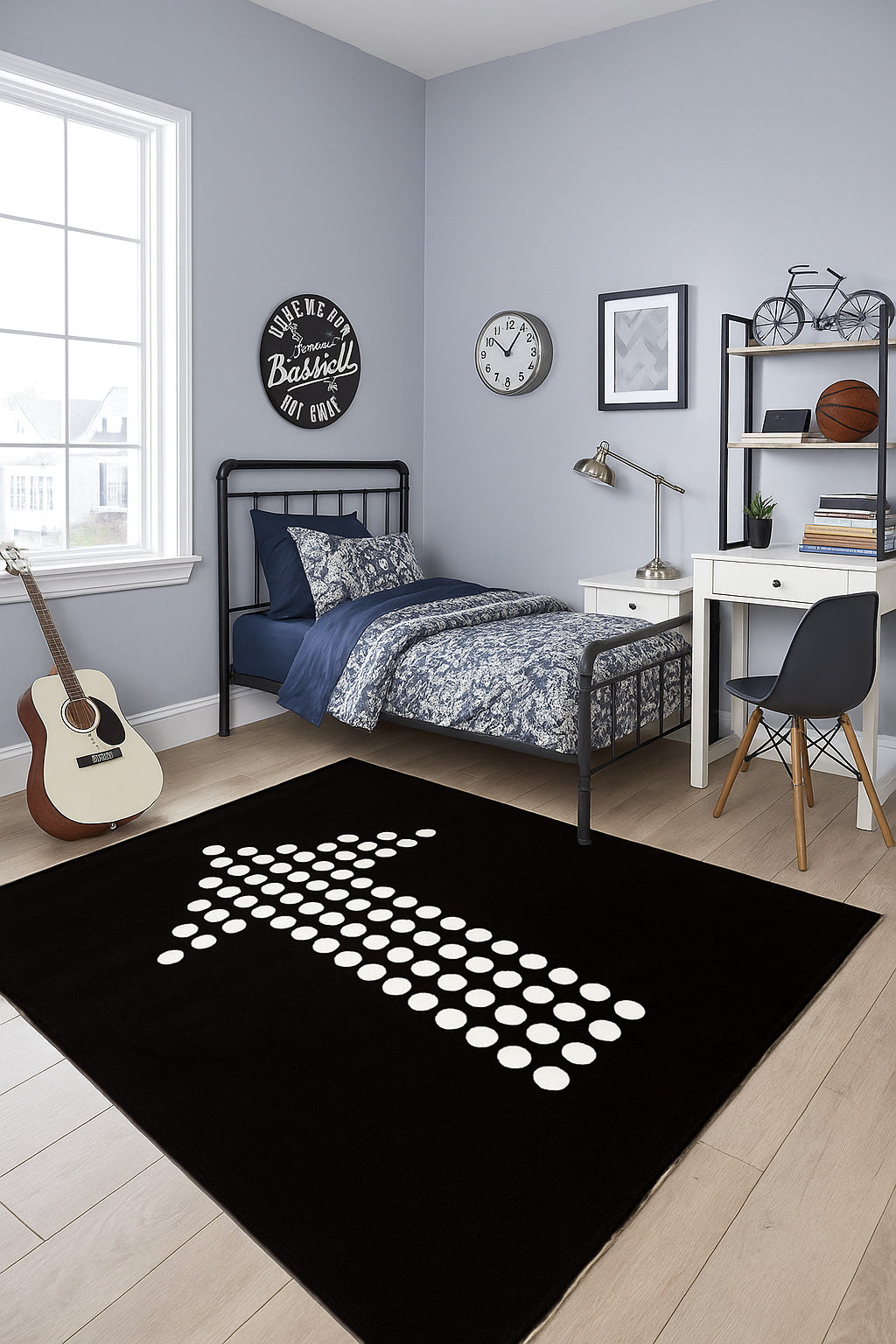 • A stylishly patterned rug the  Dotted Arrow on a Black background provides an illusion of disco lights flashing.