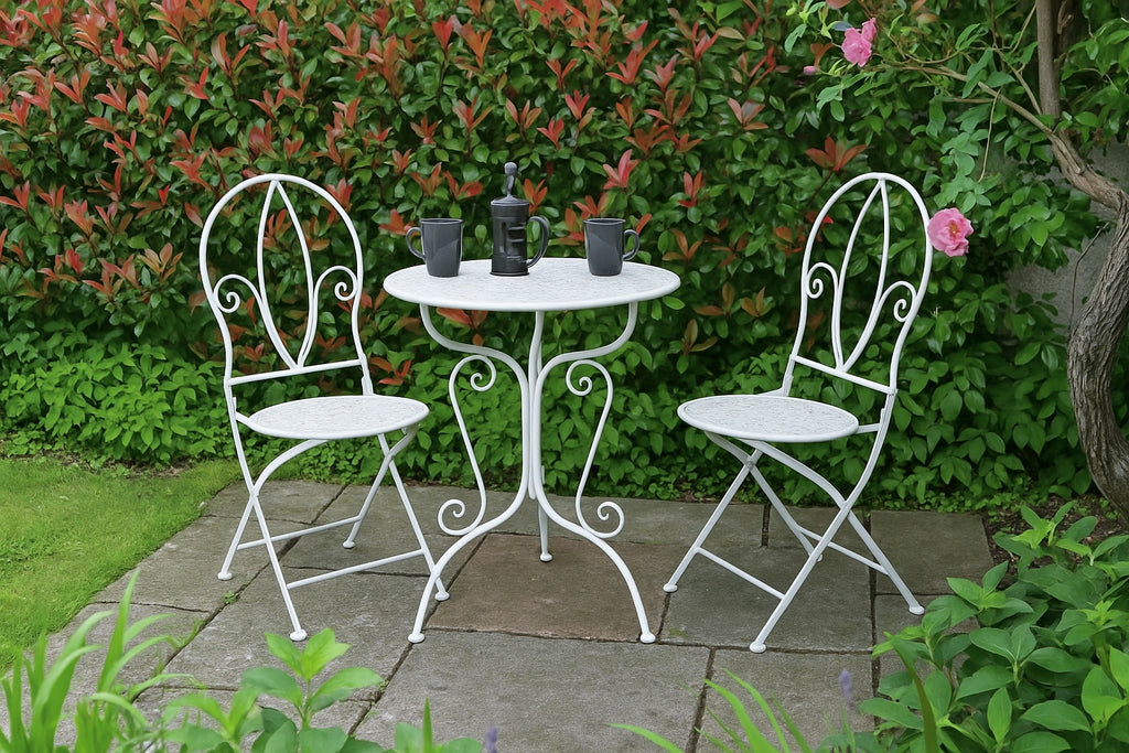 • The French vintage style garden furniture set is very easy to clean with a damp cloth. The chairs can be easily folded to save space when not in use,and the table requires only minimal assembly.