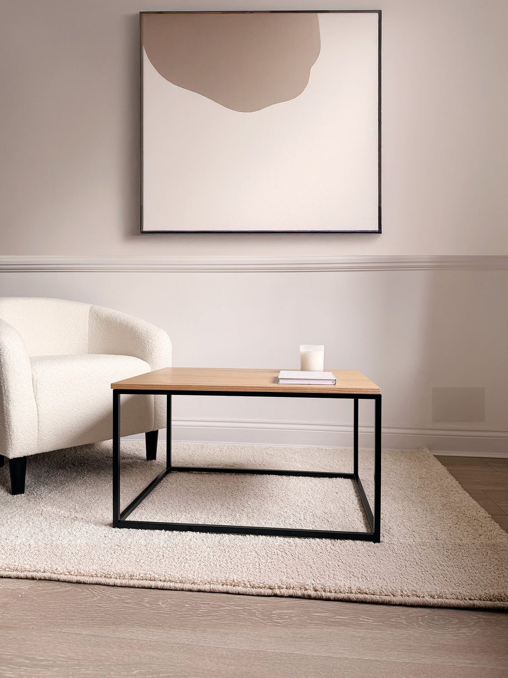 • Novani Mixed Material Nesting Coffee Table Set allows for easy storage when they're grouped together or they function as two separate tables when you display them apart. This set includes a Coffee table and an End table, all durably constructed of engineered wood. The boxed frames are with Black finish. Each tabletop is made of MDF and finished with Oak Veneer. The end table also has a raised border that will keep decorative items contained.