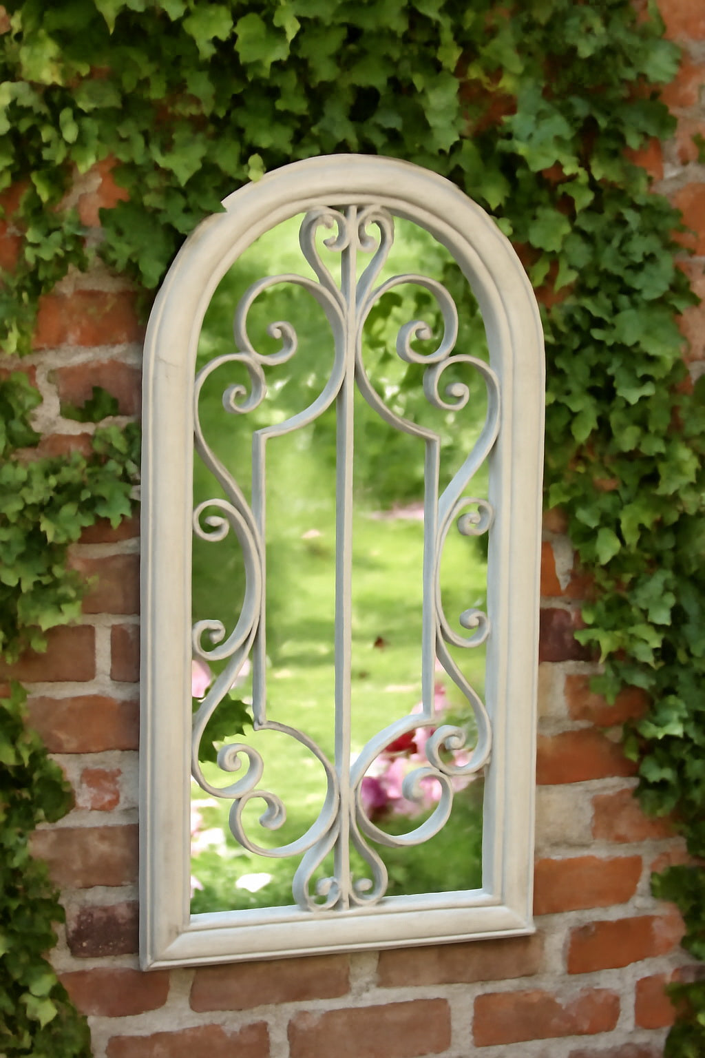 • An elegant and classically shaped arched design gives way to a romantic, intricately detailed metalwork within the frame to highlight your garden to perfection. The weatherproof metal frame has been finished in a lightly distressed sandy paint to give it an authentic aged appearance.Simply hang on a wall to create a beautiful feature in your garden. This delicately scrolled garden mirror will make a stunning focal point to your outdoor space.