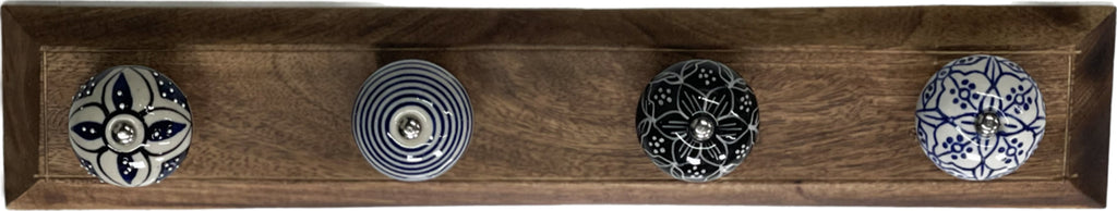 • A stylish set of 4 ceramic coat hooks in blue and black on a wooden base.